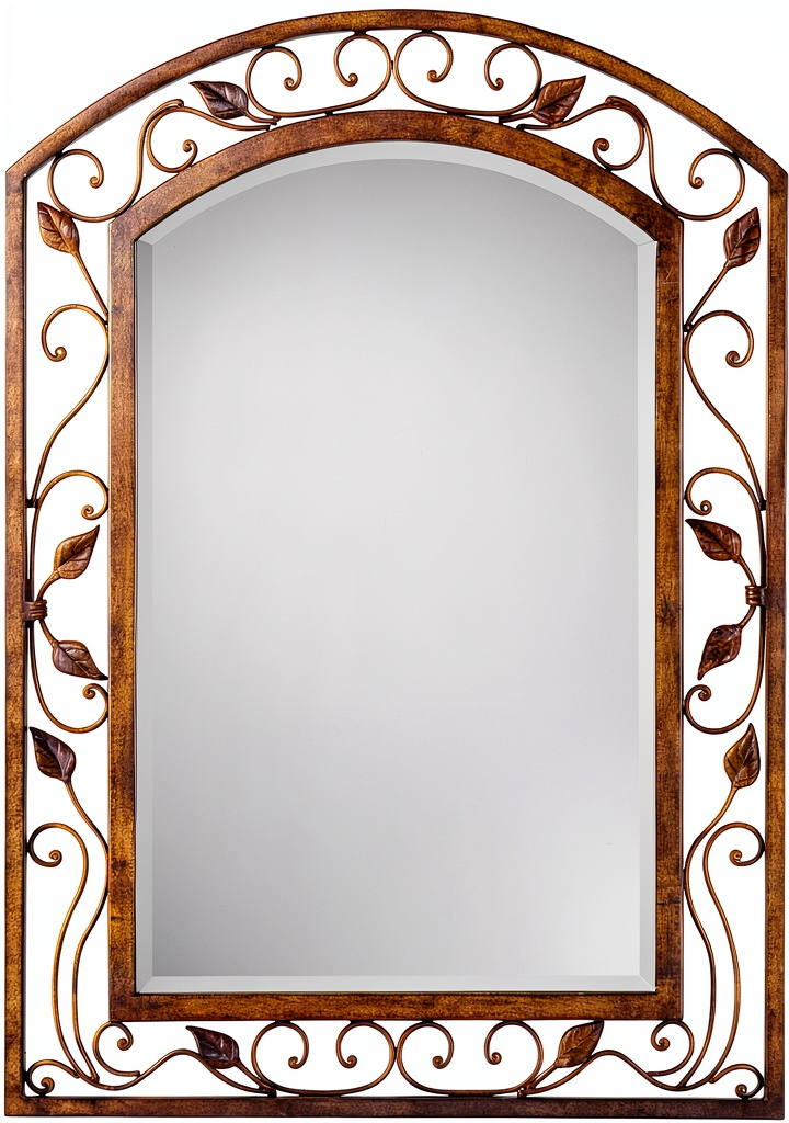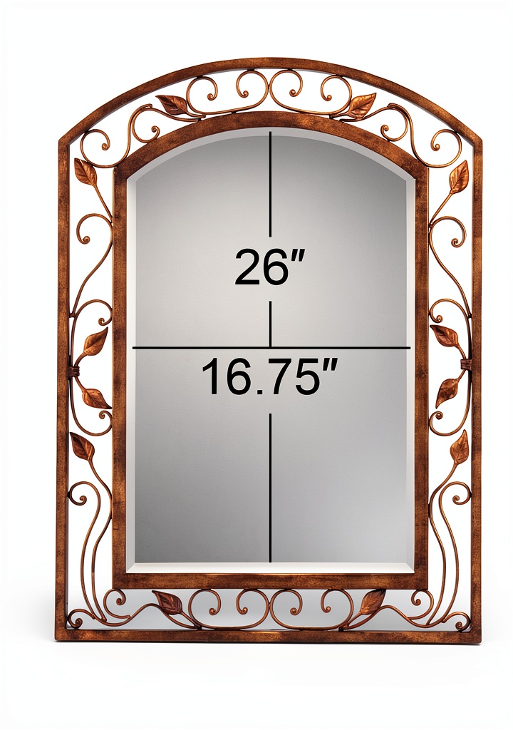 The Franklin Iron Works Eden Park arch wall mirror is a traditional-style piece designed to bring rustic elegance to your home. Crafted from high-quality metal with a French bronze finish, this rectangular mirror features an arched top and openwork leaf and vine design for a vintage aesthetic. The beveled edges add a refined touch, while the glass section measures 16 3/4 inches wide by 26 inches high, framed by a 3 3/4-inch wide border. With dimensions of 25 inches wide, 34 inches high, and 1 inch deep, and weighing 26.5 pounds, it is built for durability and comes fully assembled with D-ring hangers for straightforward wall mounting. Ideal for vertical installation, this mirror reflects both light and style, making it a standout addition to any interior space.